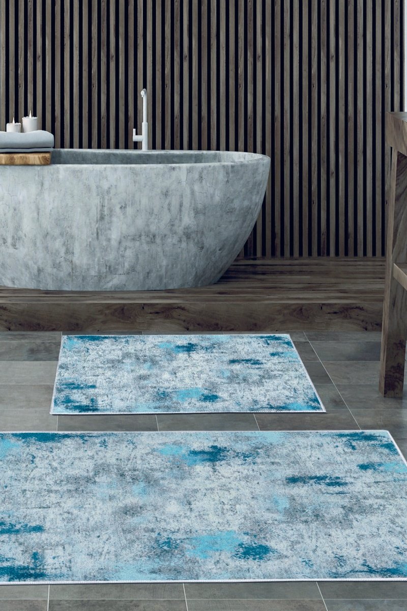 2 alfombras de baño Kt495 - Azul y blanco - 50 x 60 y 60 x 100 cm