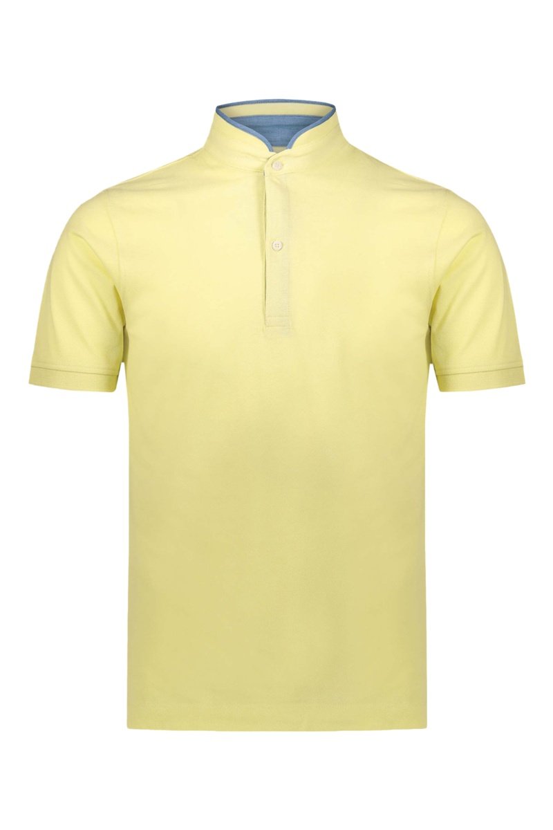 Cuello Mao con tira de botones y ribete en contraste.