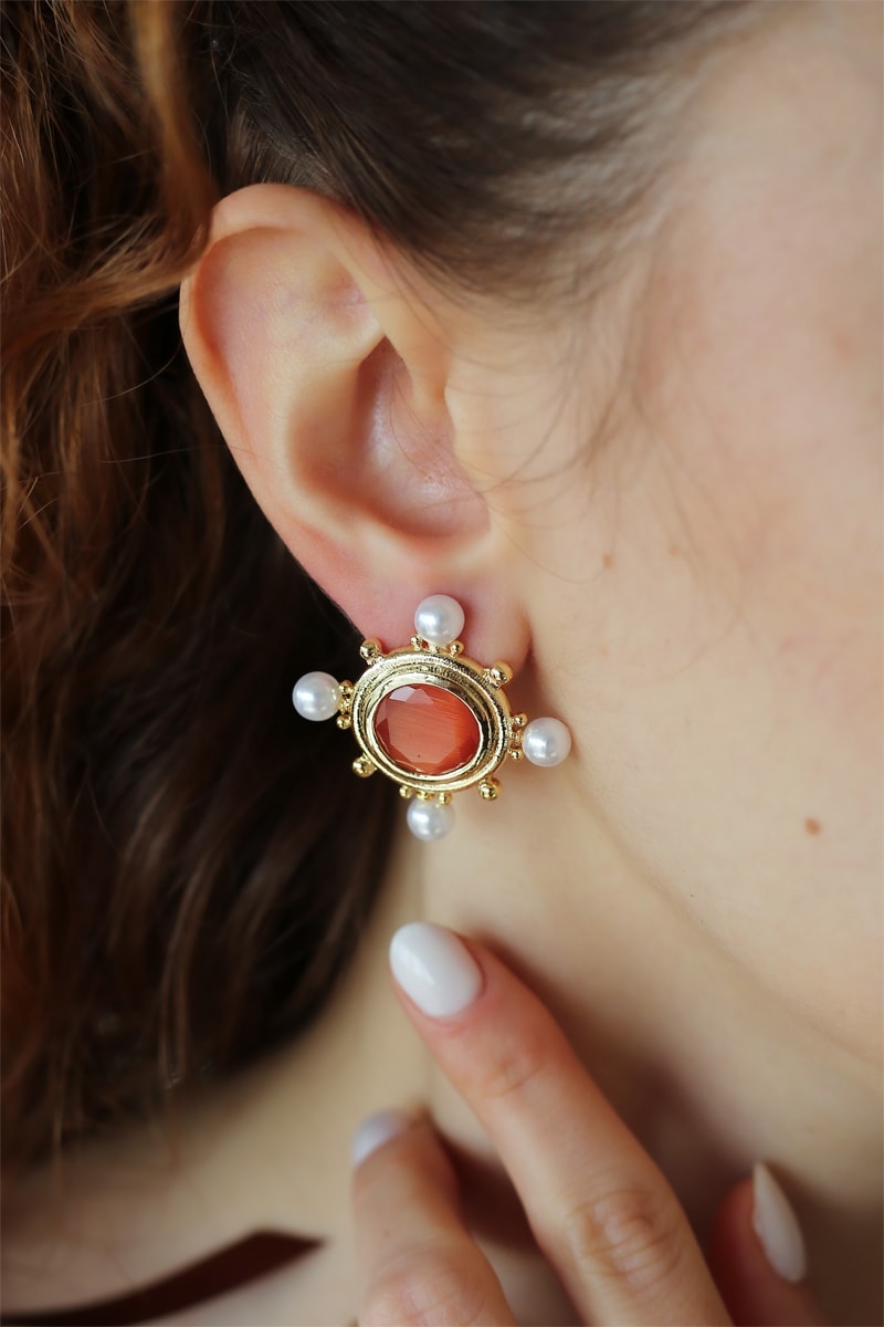Dormilonas chapadas en oro amarillo con un ojo de gato y perlas de imitación.