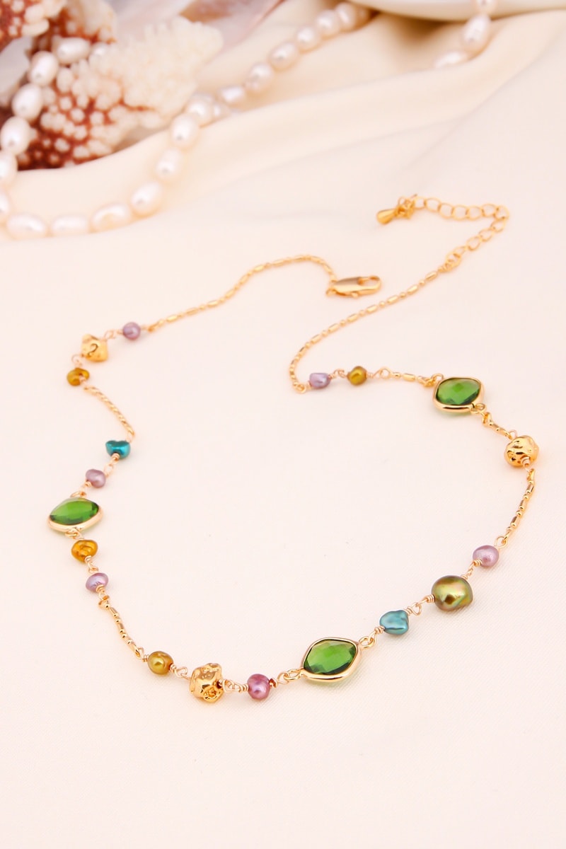 Collar chapado en oro amarillo con 3 circones y perlas de imitación.