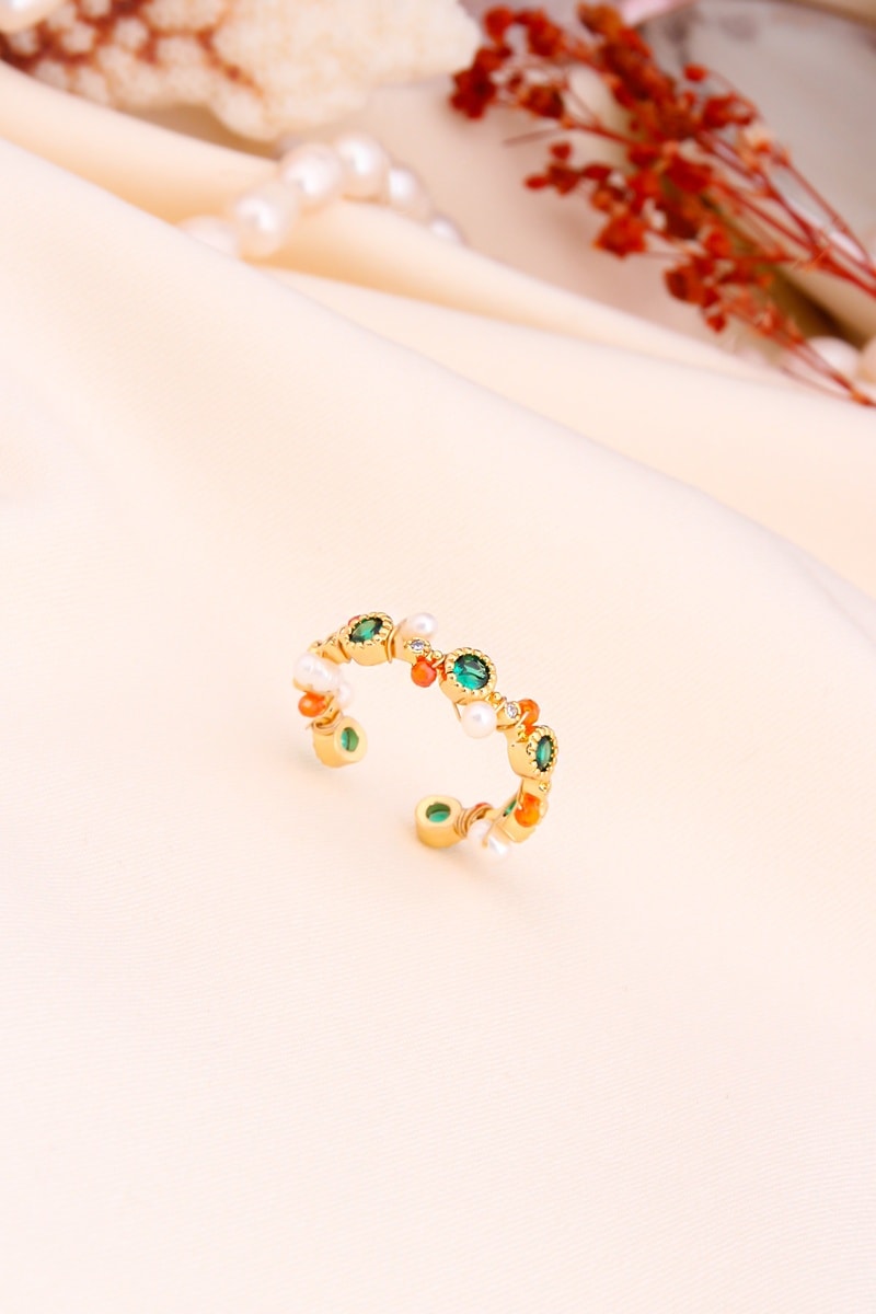 Anillo ajustable chapado en oro amarillo con circones y perlas de imitación.