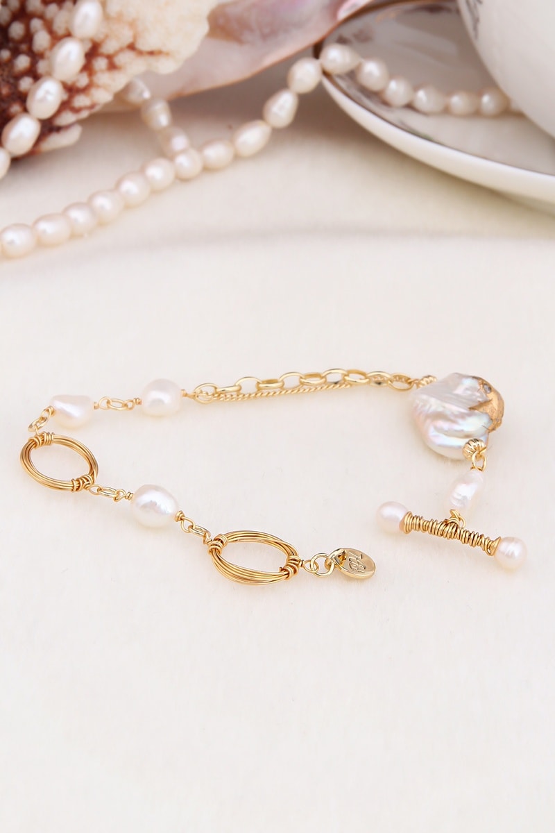Pulsera chapada en oro amarillo con 7 perlas de imitación.