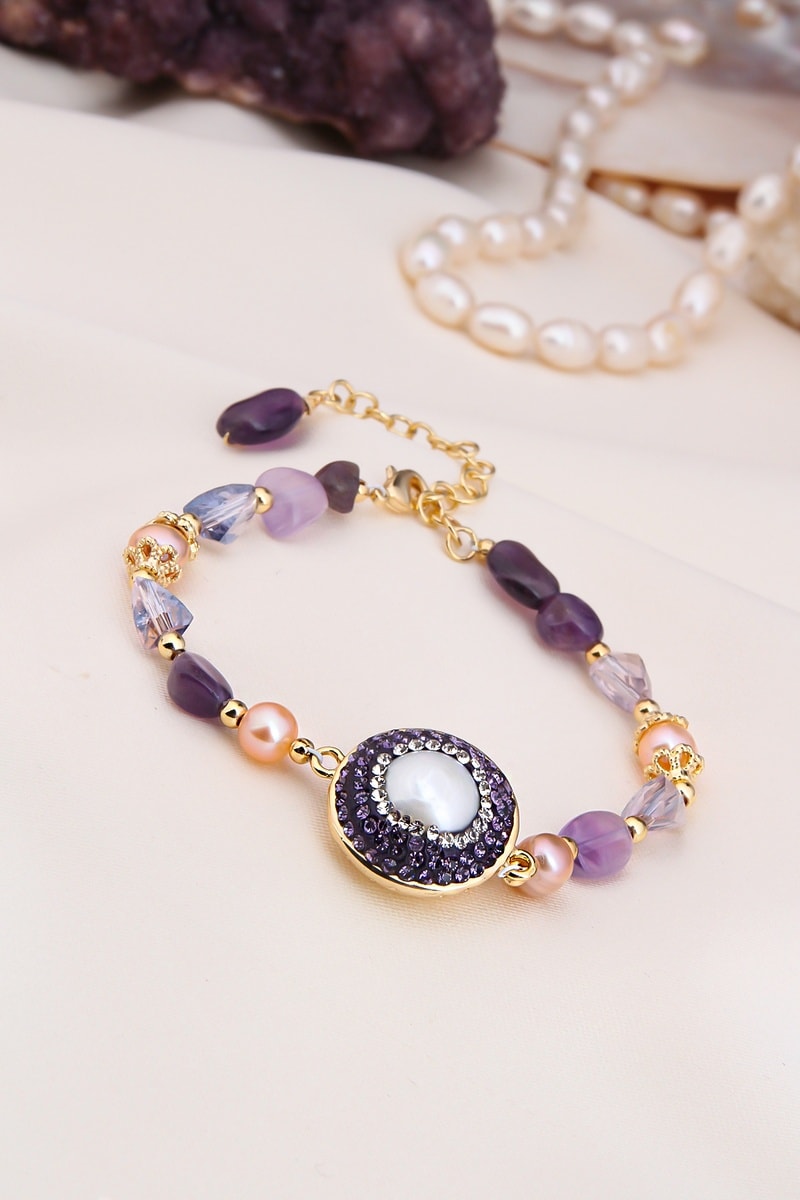 Pulsera chapada en oro amarillo con amatistas, cristales y perlas de imitación.