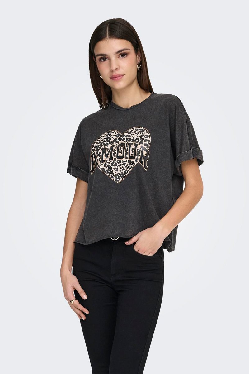 Texto, estampado de corazón y leopardo delante.