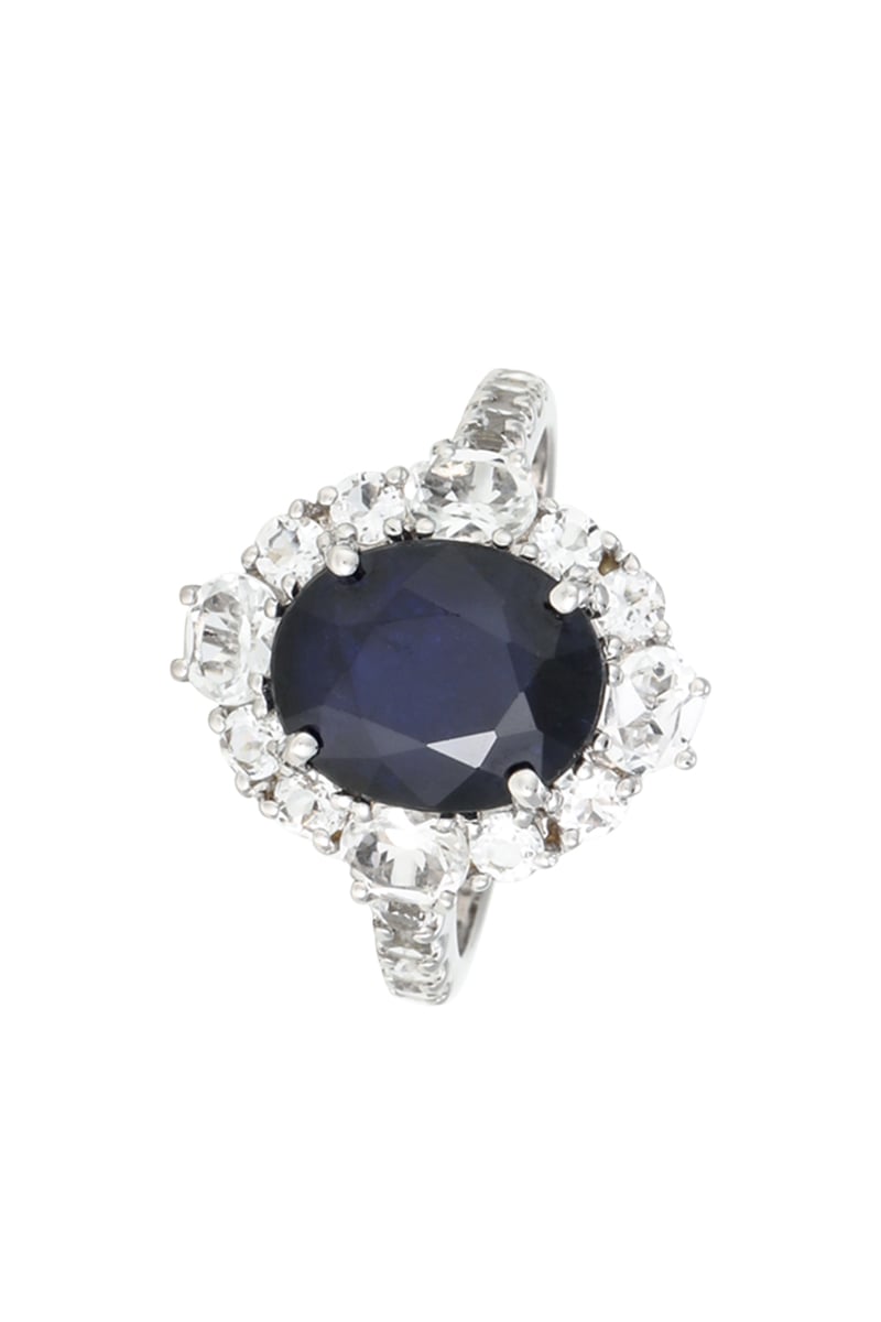 Anillo de oro blanco con topacios y un zafiro.
