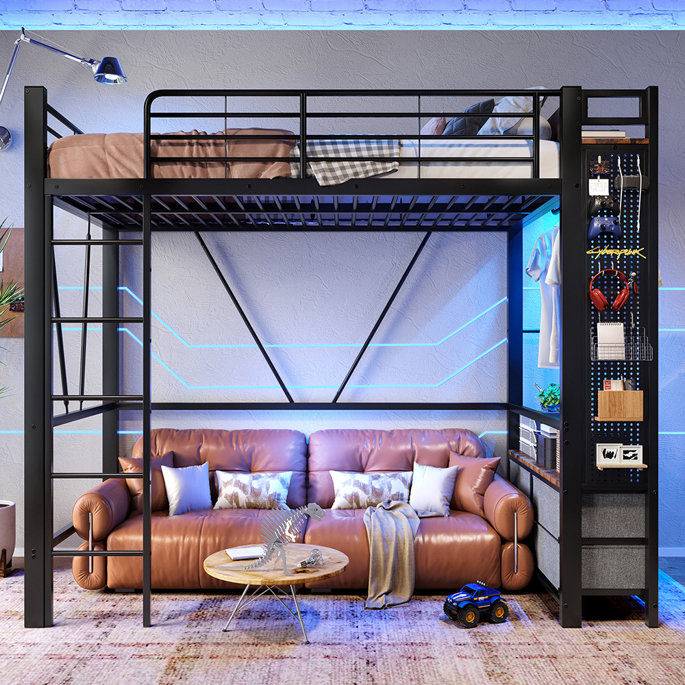 Cama alta 90 x 200 cm estructura de hierro tendedero estantes 4 cajones USB tira LED barandilla escalera tabla perforada sin colchón negro