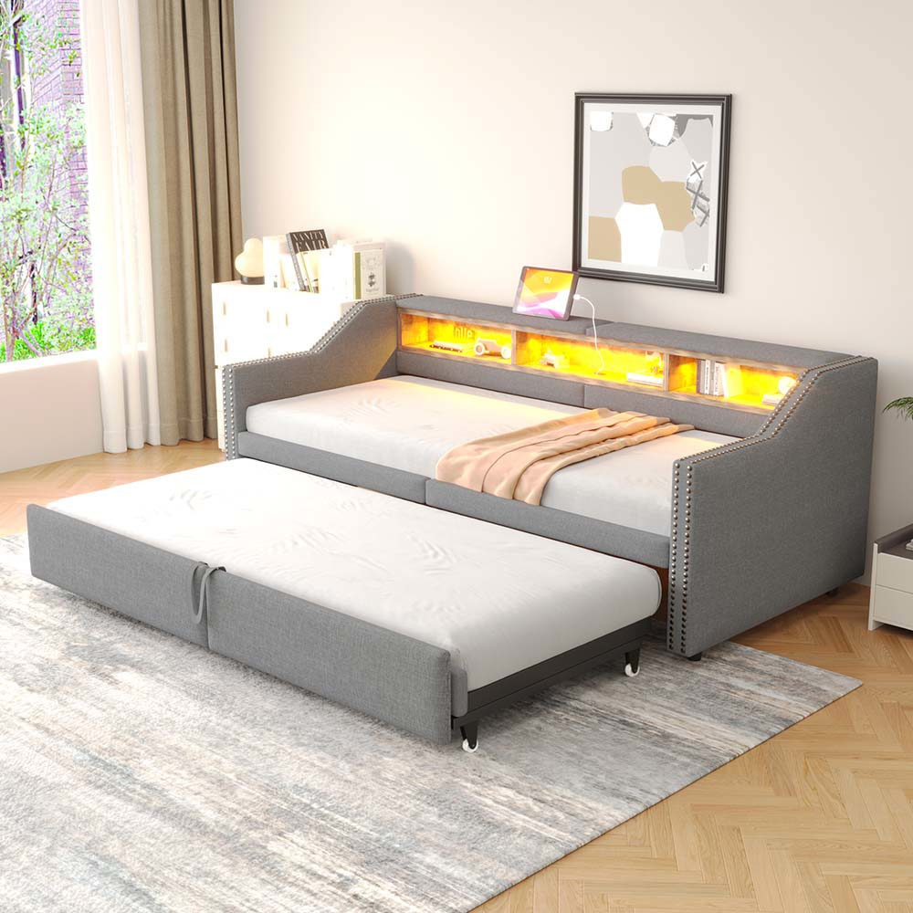 - Estructura de cama extensible: esta estructura de cama de madera cuenta con una segunda estructura de cama extensible debajo. Los dos somieres se pueden unir para formar una cama de 180 x 200 cm, lo que permite crear fácilmente una cama individual o doble. La cama nido situada debajo del sofá cama se puede extraer o deslizar fácilmente hacia dentro, lo que permite ahorrar mucho espacio. Perfecto para habitaciones pequeñas o apartamentos y habitaciones de invitados.