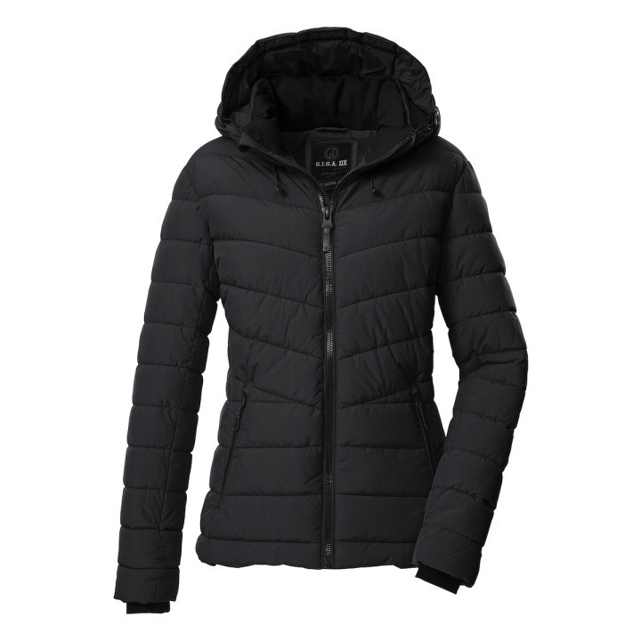 La chaqueta funcional para mujeres de G.I.G.A. DX se distingue por su elegante acolchado y sus accesorios de calidad. La tela exterior, repelente al agua y transpirable, con una columna de agua de 10.000 mm, ofrece protección contra las inclemencias del tiempo y un confort óptimo. La capucha es ajustable y se puede quitar si es necesario. Los puños de punto en los extremos de las mangas evitan la infiltración de frío y viento. Los dos bolsillos delanteros son con cremallera, lo que permite no perder nada. Un bolsillo interior ofrece espacio de almacenamiento adicional. La protección de la barbilla en la cremallera delantera evita el pellizco de la piel. Esta chaqueta ha sido impregnada sin PFAs y está parcialmente fabricada a partir de materiales reciclados.