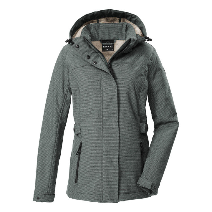 La chaqueta softshell para mujer G.I.G.A. DX, con finas rayas, es ideal para la temporada fría. Con una impermeabilidad de 8,000 mm, protege del viento y la humedad mientras es transpirable. Forrada con polar suave, te mantiene bien abrigada. La capucha es ajustable y desmontable. La talla es ajustable gracias a las correas de ajuste laterales. El dobladillo y los puños también son ajustables. La cremallera oculta de doble sentido asegura una gran libertad de movimiento y cuenta con un protector de mentón práctico. Los dos bolsillos laterales con cremallera permiten guardar tus cosas de manera segura. Esta chaqueta ha sido impregnada sin PFAS. - Chaqueta softshell mujer con capucha desmontable - Repelente al agua (8,000 mm), transpirable y cortaviento - Forro polar cálido, cremallera de doble sentido oculta - Impermeabilización sin PFAS - Talla, dobladillo y puños ajustables - Bolsillos con cremallera prácticos