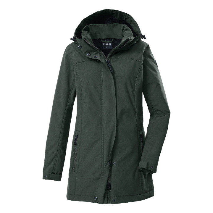 El parka softshell para mujer con capucha extraíble de G.I.G.A. DX es perfecto para la temporada fría. Protege con una columna de agua de 10,000 mm contra el viento y la humedad. Forrado con suave felpa y fleece, mantiene el calor maravillosamente. Los puños son ajustables con botones a presión. La cremallera oculta de 2 vías ofrece una gran libertad de movimiento y está equipada con una práctica protección para la barbilla. Los dos bolsillos laterales se cierran con cremalleras para no perder nada. Este parka ha sido impregnado sin PFAS y fabricado en parte de materiales reciclados. Parka softshell mujer con capucha extraíble repelente al agua, columna de agua de 10,000 mm cremallera oculta de 2 vías con protección para el mentón impregnación sin PFAS, parcialmente en material reciclado puños ajustables, prácticos bolsillos con cremallera felpa caliente y fleece en el interior