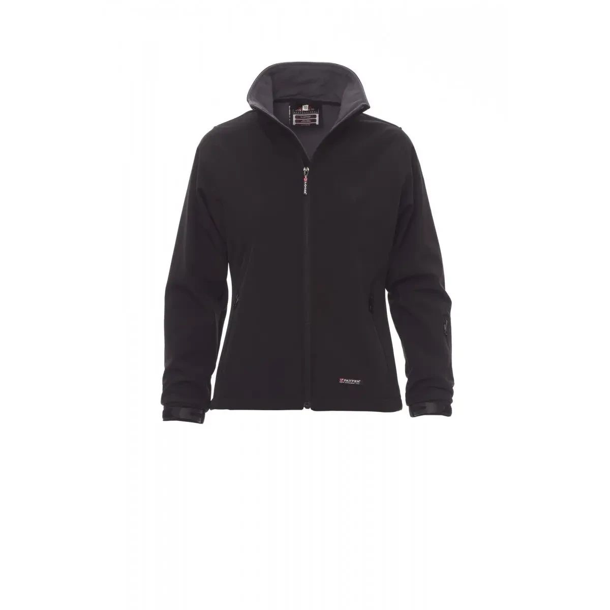 Chaqueta de mujer, corte ergonómico, cremallera larga SBS con cinta, puños ajustables con goma y velcro, dos bolsillos laterales con cremallera, un bolsillo Skipass en la manga. - Composición: 93% POLIÉSTER + 7%ELASTANO - Apariencia: SOFT-SHELL - Peso: 330 GR/MQ - Embalaje: 1/10