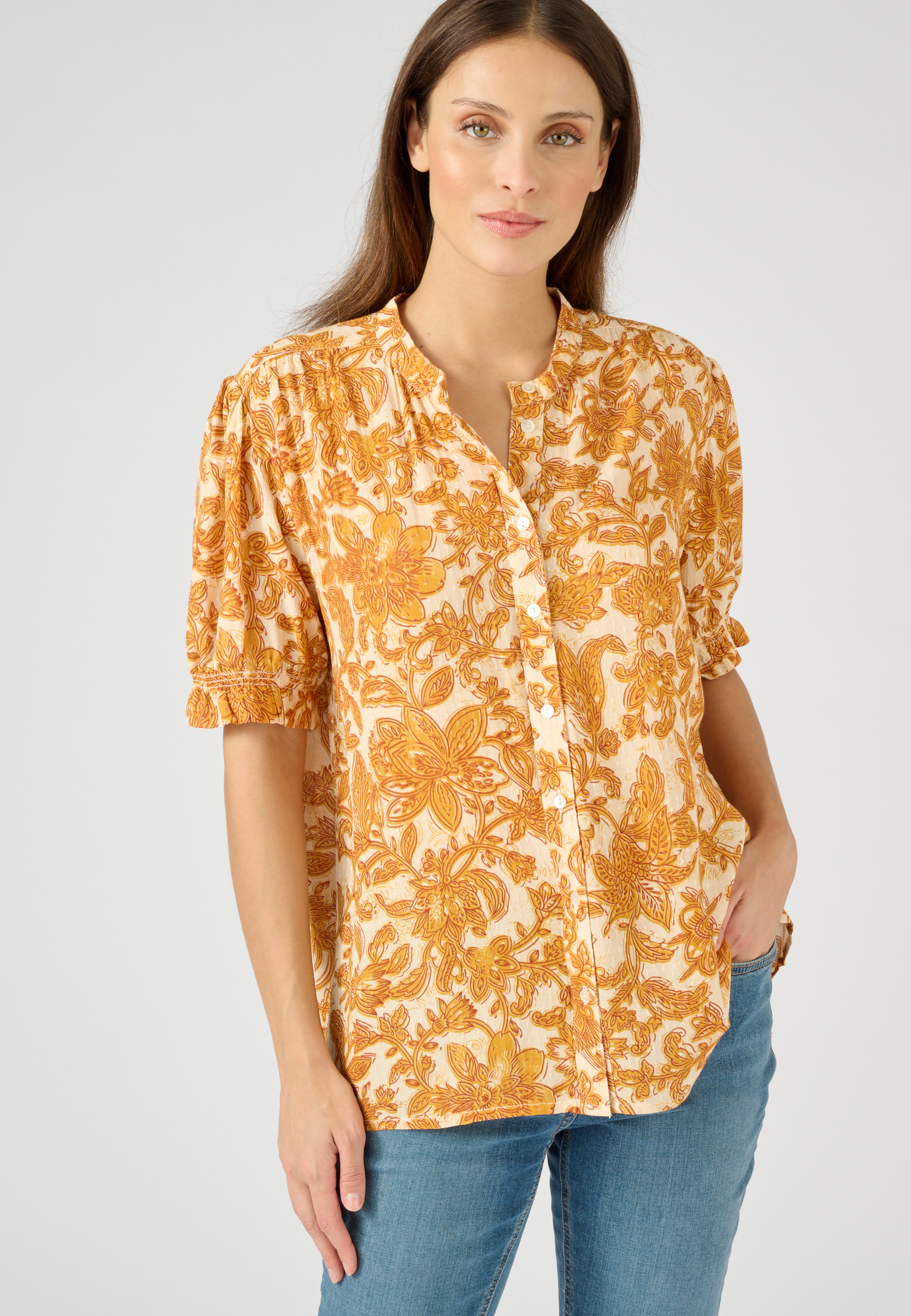 No hay nada mejor que sentirse bien con una blusa suave y vaporosa agradable en la piel. El suave tejido de viscosa de esta camisa está adornado con un efecto en relieve que realza la silueta. Su estampado de inspiración vegetal es tendencia y quedará genial con todas tus partes de abajo. Chic con pantalones blancos y sandalias de tacón. Para un look informal, elige unos vaqueros, añade un cinturón y cálzate unas deportivas. Este top de mujer tiene aplicaciones en los hombros que liberan frunces para mayor comodidad. También nos gusta el diseño de las mangas hasta el codo, fruncidas y ajustadas con elástico. Cuello redondo. Tapeta de botones para un buen ajuste. Aplicación trasera fruncida. Camisa estampada de mujer de unos 64 cm de largo.