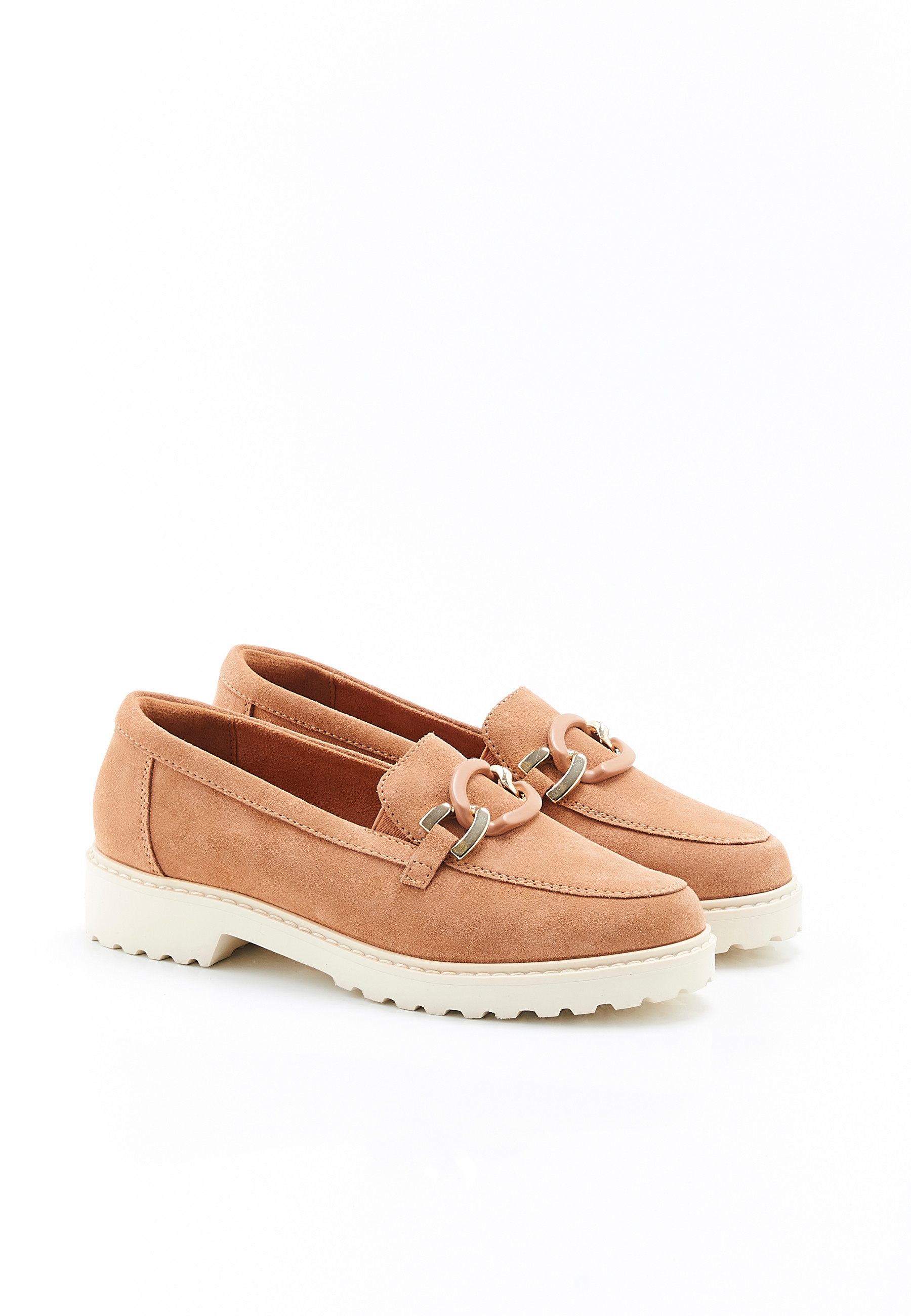 ¡Esta temporada, elige estos bonitos mocasines con suela de tracción Amortyl! Muy cómodos, cuentan con nuestra innovación Amortyl que mitiga el impacto de los golpes al caminar. Además, su plantilla de cuero es extraíble y ofrece soporte plantar para limitar la fricción. En cuanto al estilo, estos mocasines para la primavera/verano están confeccionados con un exterior de ante de vacuno, tratado para repeler el agua, adornado con una bonita cadena. Muy a la moda, estos zapatos para mujer tienen una gruesa suela de elastómero antideslizante, decididamente moderna. Gracias a sus elásticos laterales, son fáciles de poner. Forro textil. Tacón de 3 cm.