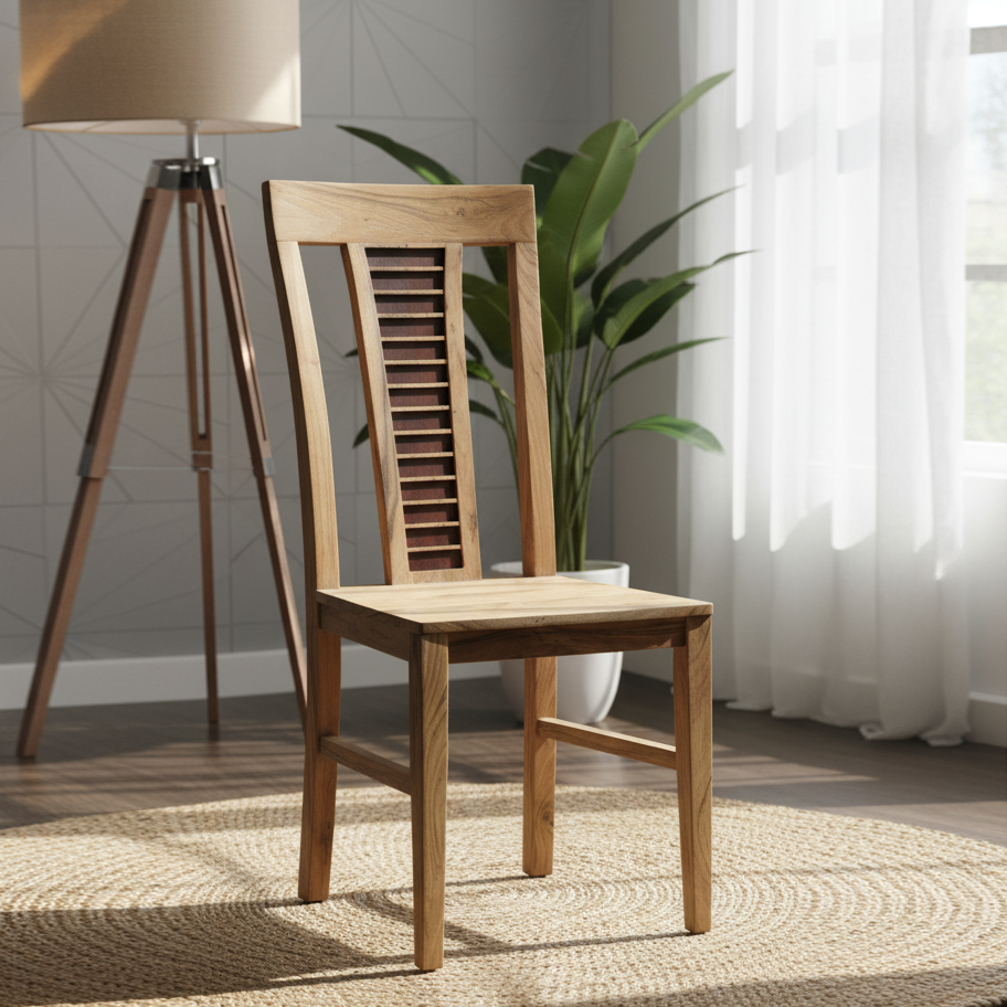 Realce su comedor o sala de estar con el sofisticado diseño de nuestra refinada silla de madera con un respaldo único. Fabricada con madera de alta calidad, esta silla cuenta con un respaldo bellamente tallado que le da un toque artístico a su elegante diseño. El acabado de madera natural realza las vetas únicas, creando un ambiente cálido y acogedor.