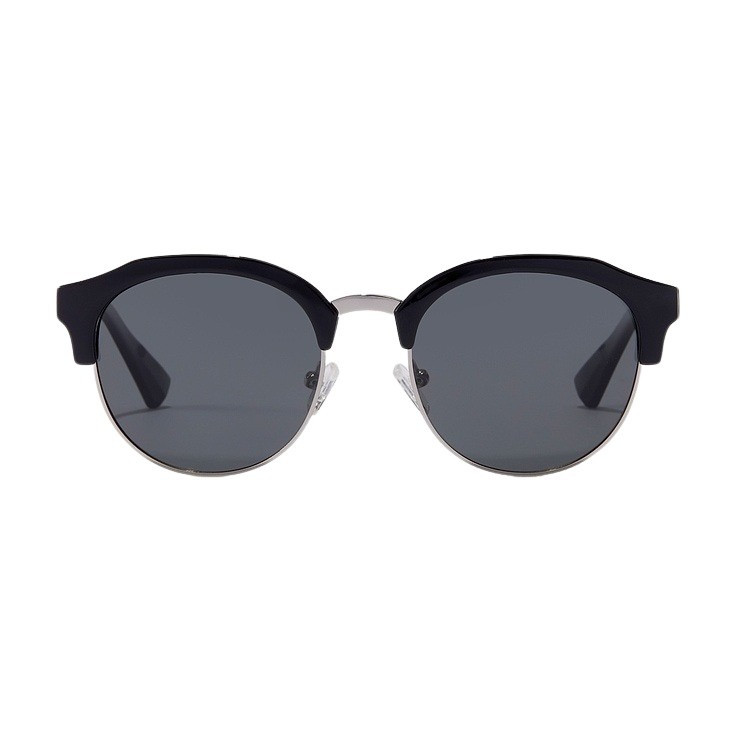 En esta versión del diseño Classic Rounded, las lentes polarizadas oscuras y las patillas y los aros superiores negros brillantes contrastan con el puente de metal plateado pulido y los aros inferiores en relieve.