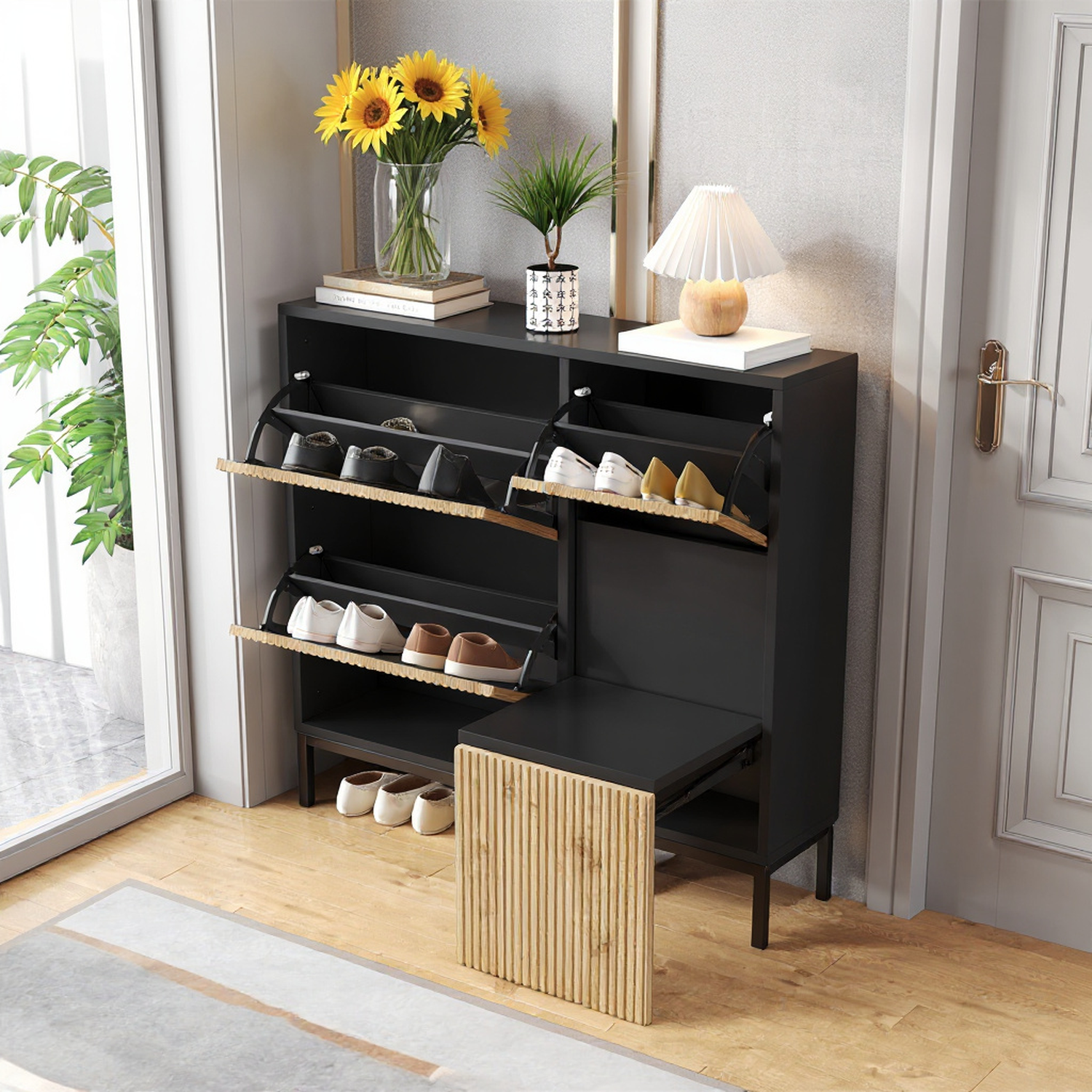 Inteligentemente dividido, este zapatero incluye dos estantes, un banco cambiador y un compartimento inferior abierto que puede alojar 12 pares de zapatos, o 16 pares de diferentes tamaños. El compartimento grande es adecuado para zapatos de hombre, mientras que el más pequeño es para zapatos de mujer y niños. El espacio abierto es perfecto para guardar zapatillas, satisfaciendo las necesidades de toda la familia.